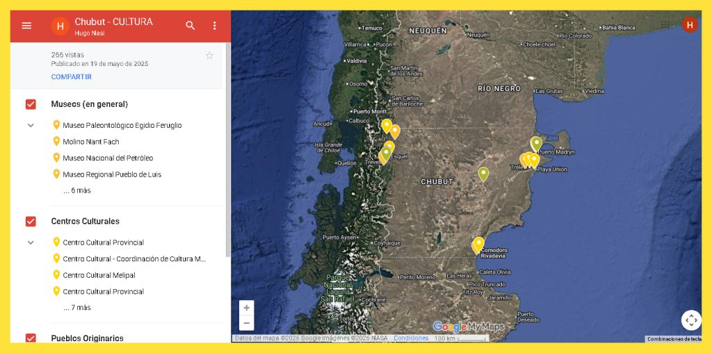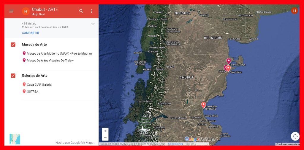Provincia de Chubut arte Info complementariaLINKS . VIDEOS . ARTÍCULOSen www.arteargentino.com DOCUMENTALESde colección: GAL Galeria Digital de Arte Inmersivo – Tecnología y Creatividad – Con Doris Romerahttps://www.youtube.com/watch?v=EqpMcE_euaITomas Schinelli «Amasando hierro»https://www.youtube.com/watch?v=df2nq_Q4mQ4&t=1191sDaniela Mastandrea – CFC Consejo Federal de Cultura https://www.youtube.com/watch?v=lKvetf5uisw Lucía Pellegrini – ChubutMuseo de Arte Moderno de Buenos Aireshttps://www.youtube.com/watch?v=HQrZfKlT8QY «Maria Sabina» Proceso – Gaby Kovahttps://www.youtube.com/watch?v=TtHgqp6u8mw«Ni un alma del Pueblo SelK´nam» Documental sonoro. por Pablo Paniagua y Colectivo «Bajo los huesos»https://www.youtube.com/watch?v=35CF_tUJfVk&t=261s SÍNTESIS -:- lo más destacado -:- Arte:en construcción cultura Info complementariaLINKS . VIDEOS . ARTÍCULOSen www.arteargentino.com DOCUMENTALESde colección: 3 Museos en Chubuthttps://www.youtube.com/watch?v=xIScxkqx_DI SÍNTESIS -:- lo más destacado -:- Culturaen construcción turismo Info complementariaLINKS . VIDEOS . ARTÍCULOSen www.arteargentino.com DOCUMENTALESde colección: en construcción SÍNTESIS -:- lo más destacado -:- Turismoen construcción buzón de sugerencias Una manera de contar la verdadera riqueza de Argentina © 2025 Hugo Nasi – Arte, Cultura y Turismo Georreferenciado de Argentina